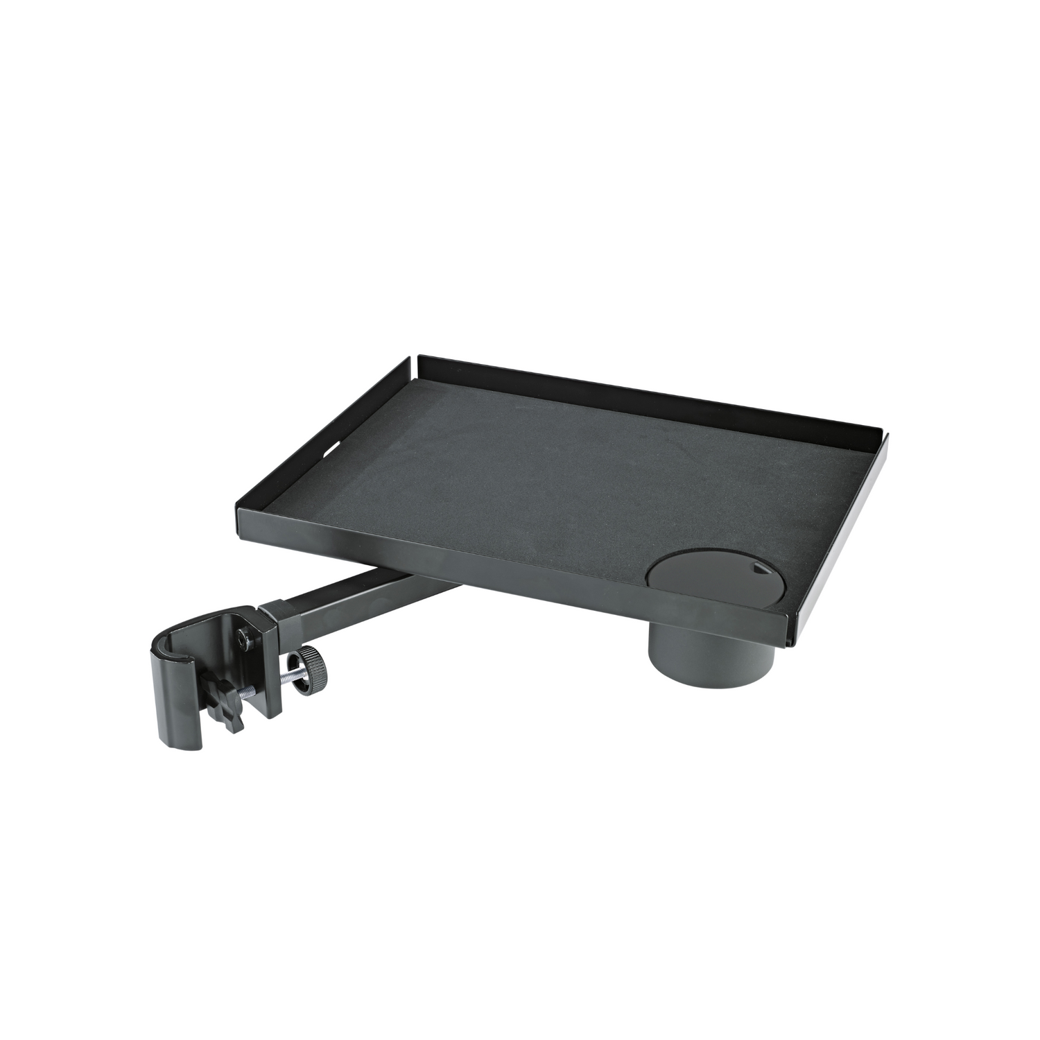 This practical tray attaches to all tripods up to 30 mm tube diameter. The usable shelf space is 250 x 330 mm and is ideal for smaller electronic devices such as mixers, controllers or tablets. An additional slot in the plate ensures convenient cable routing. Another useful feature is the can/cup holder. The sturdy steel construction is also ideal for storing percussion and other music accessories. A foam insert absorbs vibrations and prevents unpleasant background noises. Additionally, the distance to the tripod as well as the lining up of the plate can be individually adjusted.